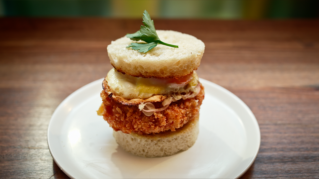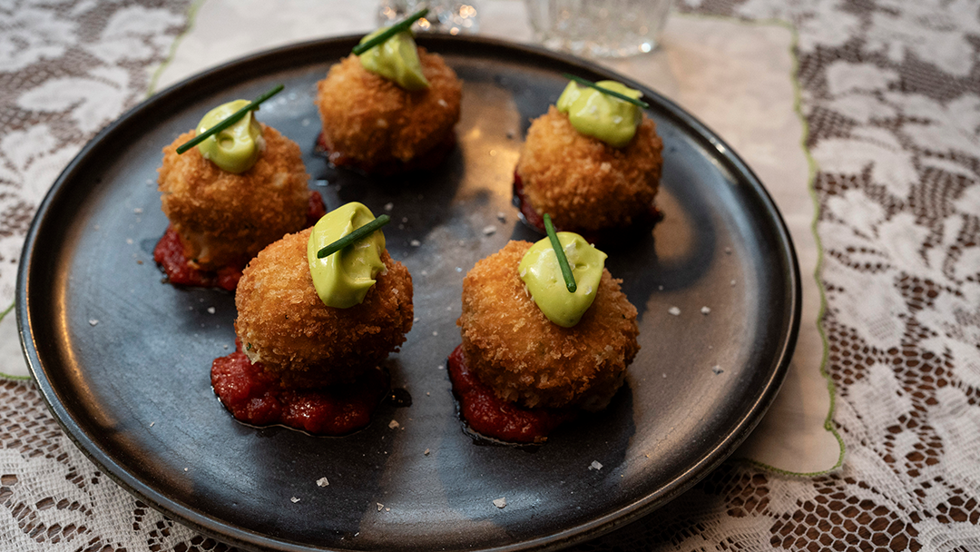 Ben (redeeming himself from last night's horrendous debacle) made Salt Cod Croquettes, Sugo & Basil Mayonnaise. Sugo is a tomato and herb sauce which goes on the bottom of the croquette while the mayo goes on the top.
