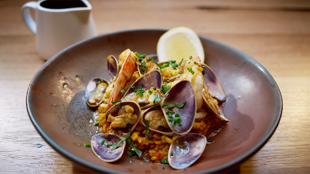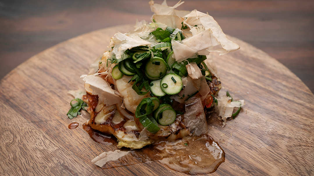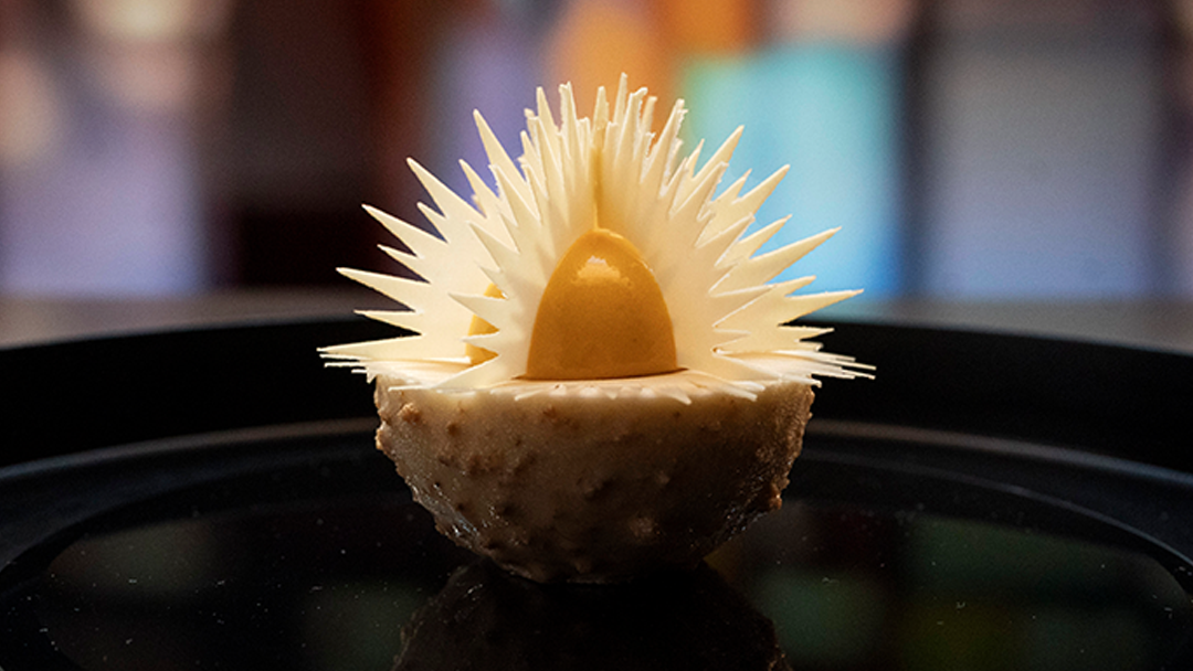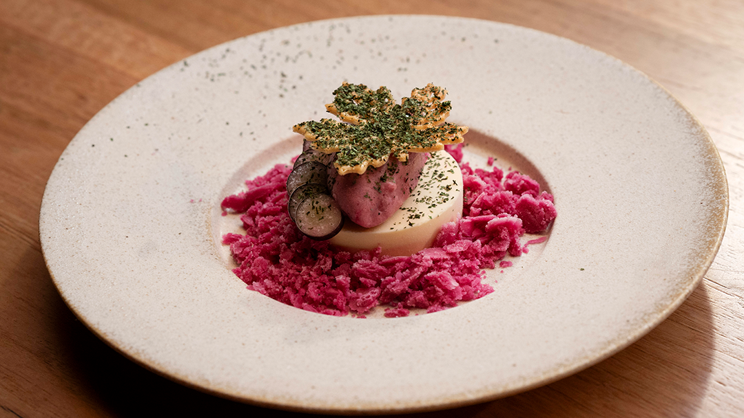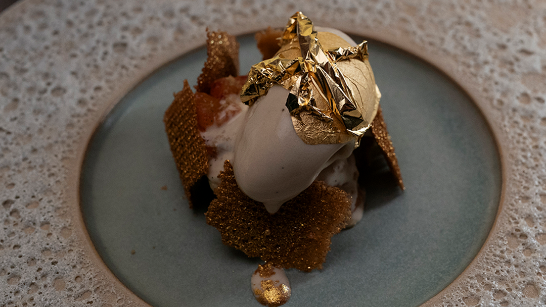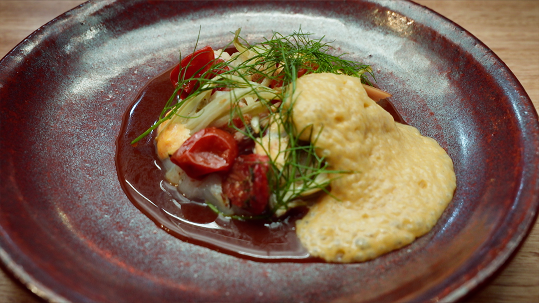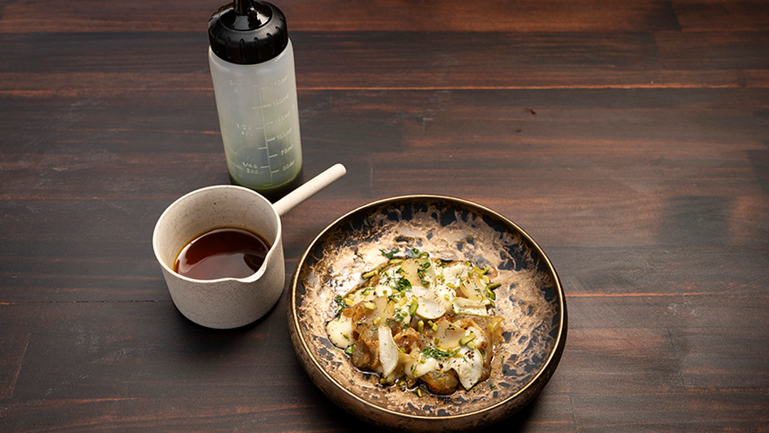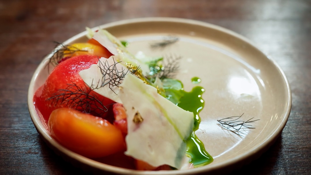 Jamie made Spiced Harmour Crudo, Loomi, Saffron & Date Broth, Cured Lebanese Zucchini, Kirschke (Milk Powder) Emulsion, Pickled Plum, Turmeric & Parsley Oil & Pistachio Crumb.