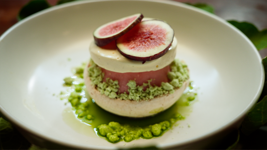 Callum (choosing Anna Pavlova) made his own spin of Pavlova with flavours of Fig & Strawberry Sorbet, Strawberry Coulis, Creme Fraiche Mousse, Fig Leaf Oil, Fig Leaf Sherbet & Fresh Figs.