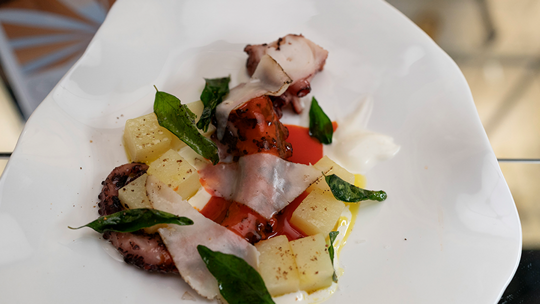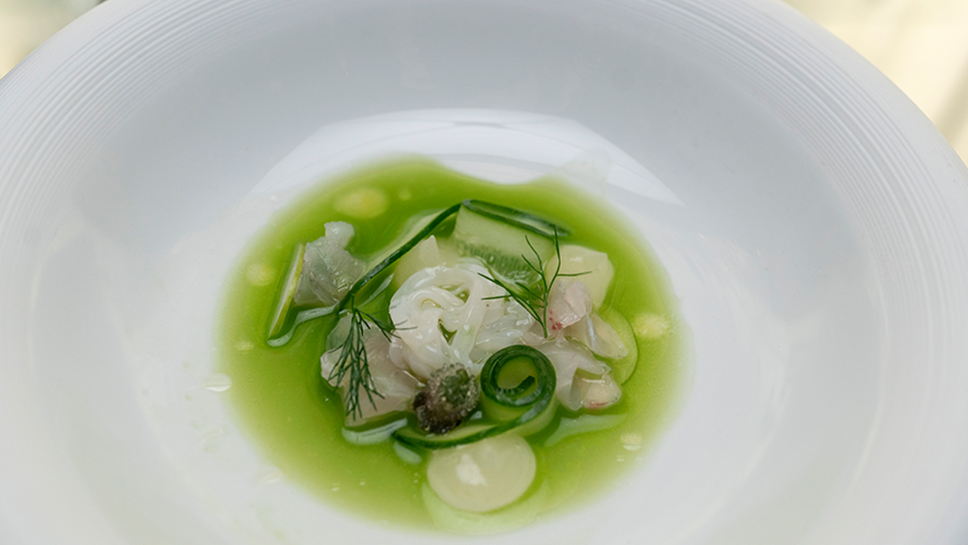 Snezana's Crudo, Squid Noodles, Cucumber & Mint Consomme, Lemon Gel & Saffron Oil & Blinq Blossom.