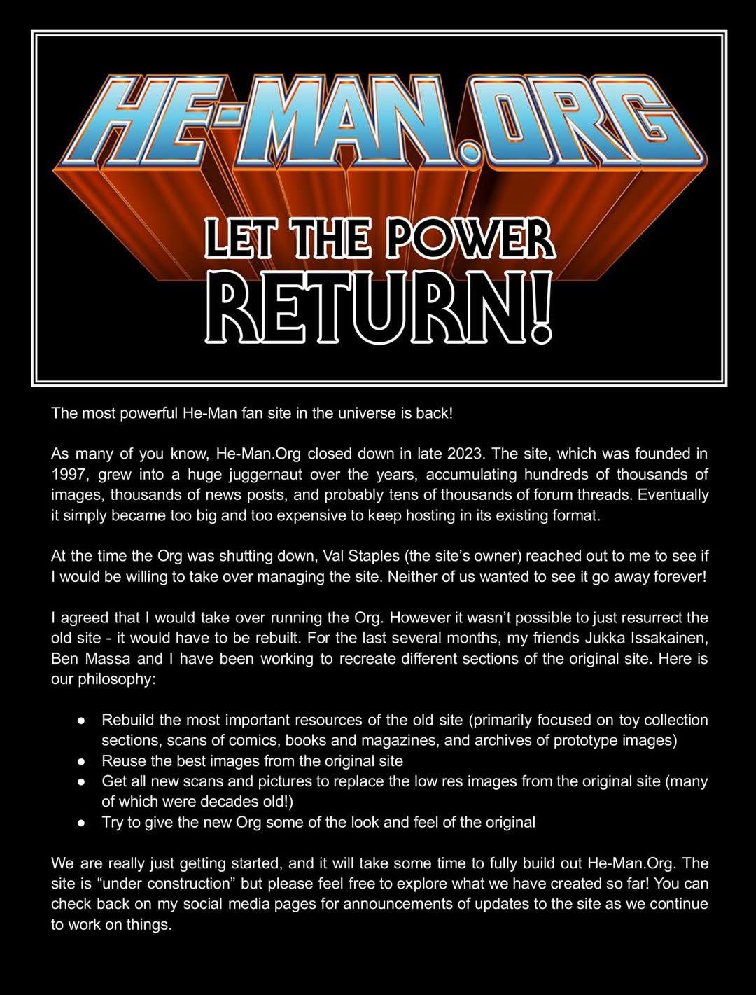 As many of you know, He-Man.Org closed down in late 2023. The site, which was founded in 1997, grew into a huge juggernaut over the years, accumulating hundreds of thousands of images, thousands of news posts, and probably tens of thousands of forum threads. Eventually it simply became too big and too expensive to keep hosting in its existing format.