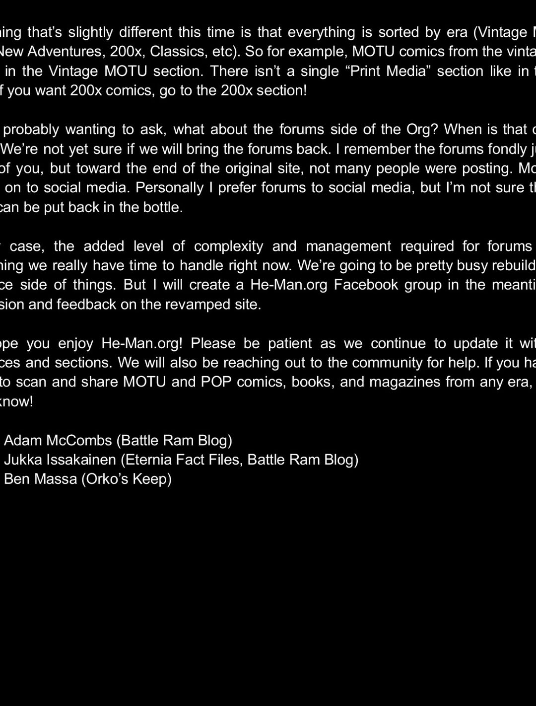 In any case, the added level of complexity and management required for forums is not something we really have time to handle right now. We’re going to be pretty busy rebuilding the resource side of things. But I will create a He-Man.org Facebook group in the meantime for discussion and feedback on the revamped site.