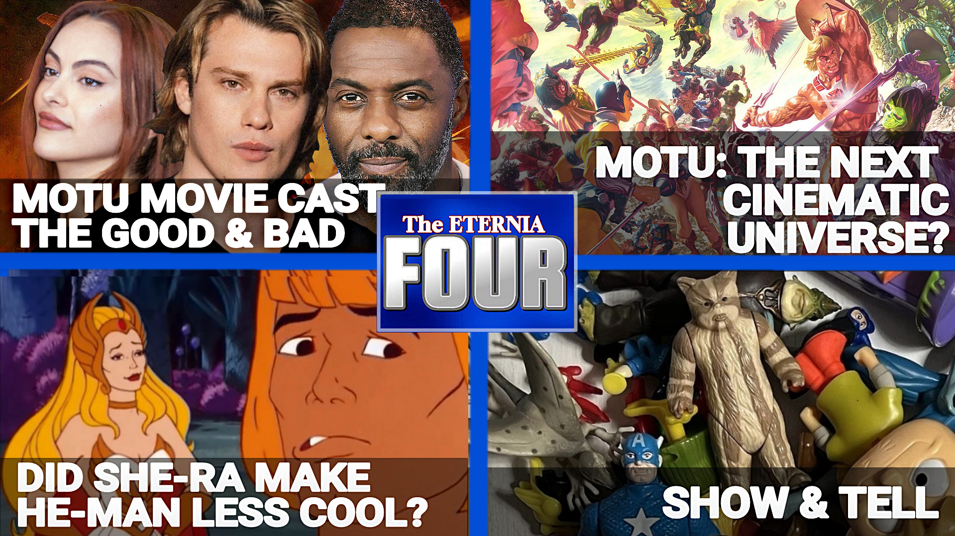 Welcome to The Eternia FOUR! We are excited to debut today the first episode of "The Eternia Four", a talk show that features four Masters of the Universe related topics every episode. With hosts: AJ, Mike, Jay and Shane, today they discuss the following: TODAY'S TOPICS: What are the Strengths and Weaknesses with the "Masters of the Universe" Movie Cast? Can "Masters of the Universe" be the next Cinematic Universe? Did the introduction of She-Ra 40 years ago make He-Man less cool? Pick something in our collection that is NOT "Masters of the Universe" related and tell us why you…