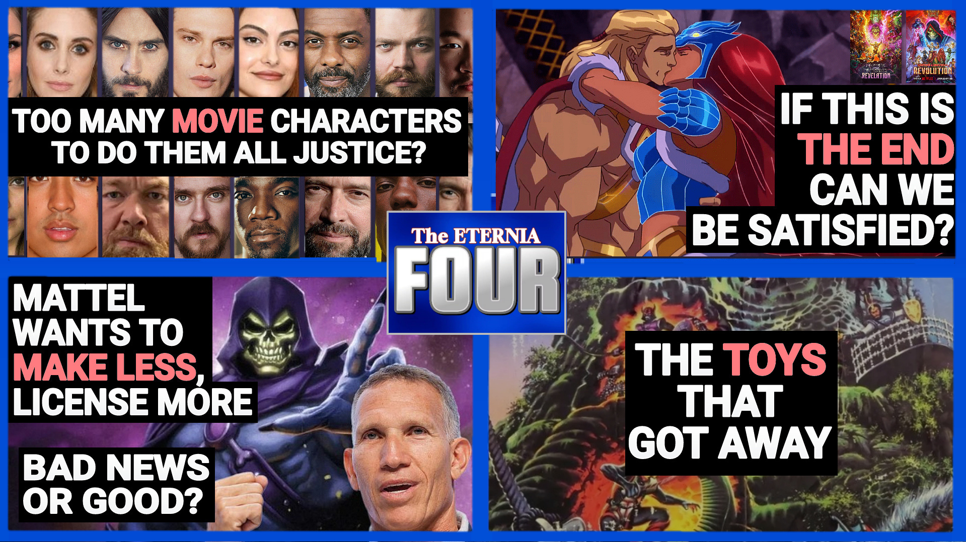 Welcome to The Eternia FOUR! We are excited to debut today our second episode of “The Eternia Four”, a talk show that features four Masters of the Universe related topics every episode. With hosts: Mike, Jay, Shane, and AJ today they discuss the following: TODAY’S TOPICS: Has the character roster for the upcoming "Masters of the Universe" Movie become too massive to do all of the characters justice? Can you be satisfied if "Masters of the Universe: Revolution" is the last season? Do you feel Mattel's transition towards becoming more of an IP company is a step in the right direction? Pick one of the…