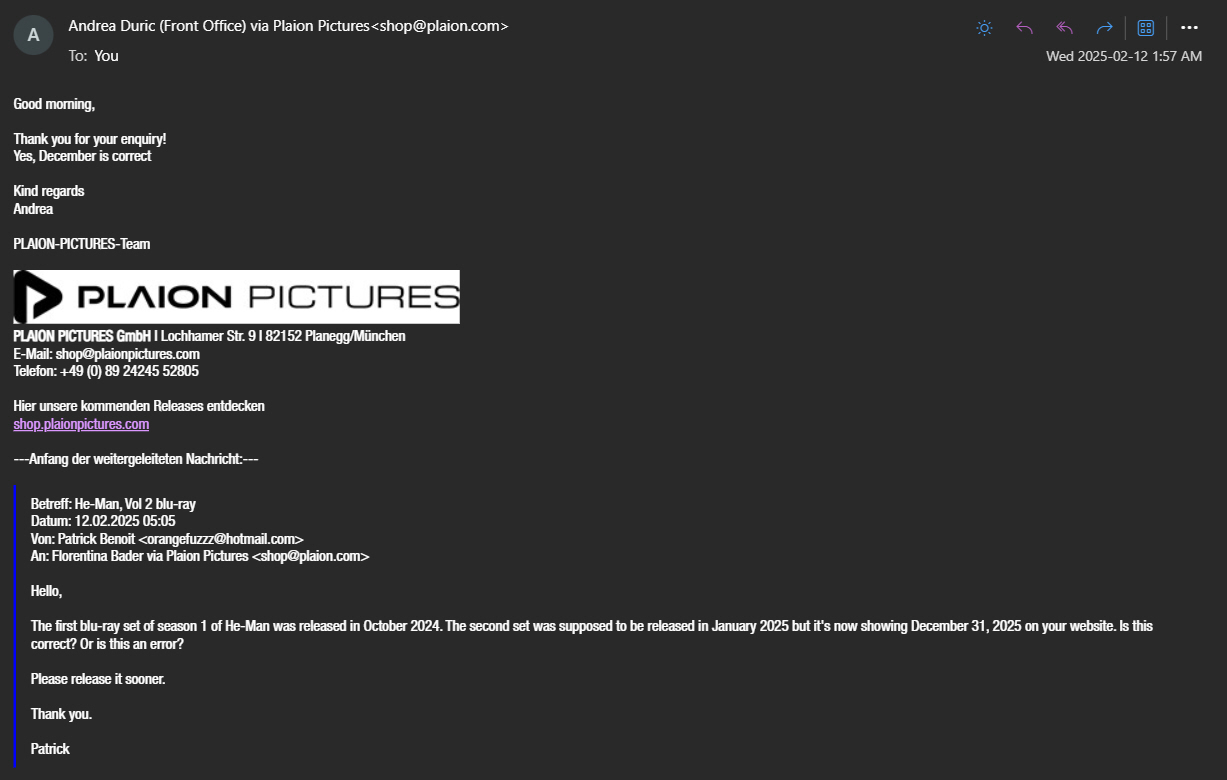 So, up until recently, volume 2 of the German blu-ray set from Plaion was scheduled to be released January 15, 2025. This was confirmed here on ForEternia: https://he-mania.com/2024/10/plaion-pictures-announces-volume-two-he-man-and-the-masters-of-the-universe-blu-ray-hd-set-coming-this-january