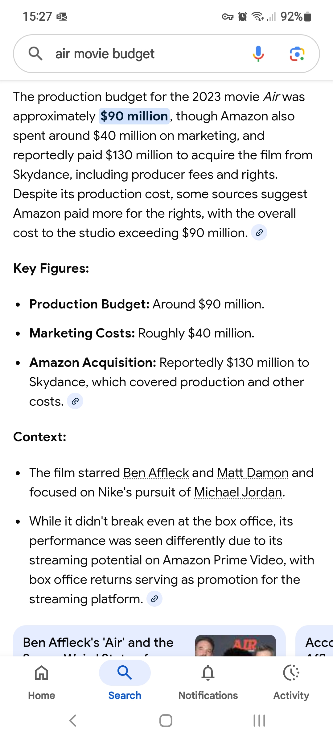 Mattel will through the toys and social media, for Amazon this is likely just a joint release with a shared budget for Prime. I mean check out what they spent below on the Air movie alone as one example. 200m in their particular context is practically nothing. Which makes me wonder even more about the lack of, well, anything related to this movie. I could be absolutely wrong and they're about to flood the zone, but sheesh.