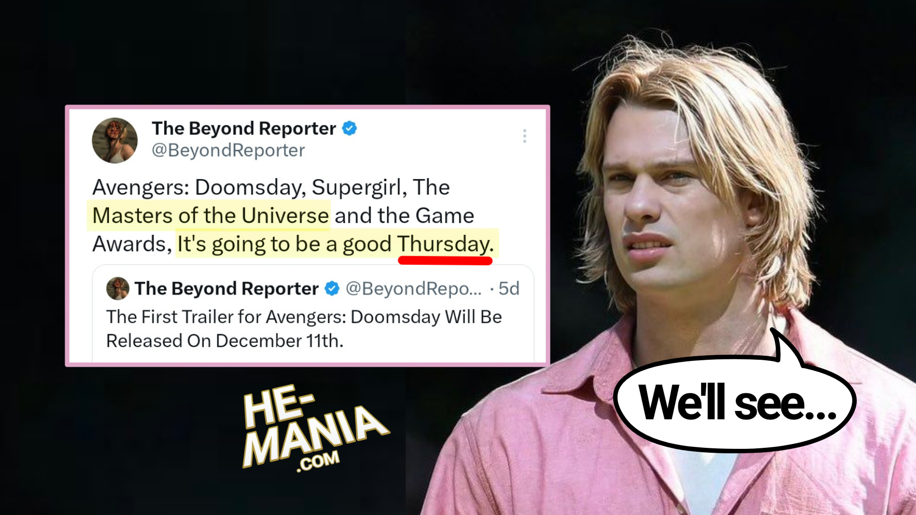 We'll see! A couple of days ago we reported that influencers like Grace Randolph, Cinema Braniac and The Beyond Reporter believed or have outright declared that the new trailer for the New "Masters of the Universe" Movie was coming out this week. Well now, one of those 'insiders' The Beyond Reporter pinpointed a day. Thursday, December 11th. Check it out: Can we trust this source? We don't know, but it does makes sense to get a trailer in front of audiences for Avatar: Fire and Ash (considering the billion dollar blockbusters the Avatar franchise has become)... ..and Mattel's Barbie teaser…